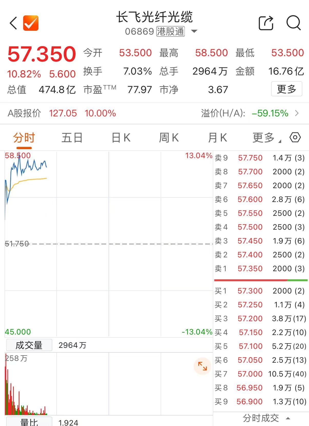 上证报中国证券网讯(记者 徐潇潇)12月22日早盘,港股光通信概念股延续强势,长飞光纤光缆一度涨超11%,汇聚科技涨超14%,剑桥科技H股涨超5%。截至10时37分,长飞光纤光缆涨10.82%,报57.35港元/股。